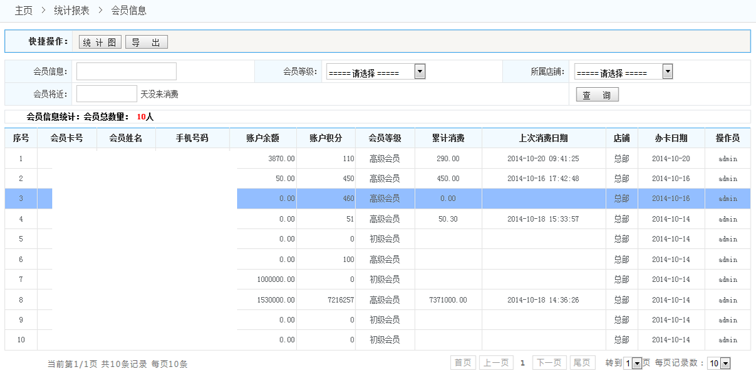會員信息統(tǒng)計: 1.統(tǒng)計圖:將符合條件的數(shù)據(jù)以統(tǒng)計圖形式展現(xiàn)出來 (如下圖) 2.導(dǎo)出:將按條件查詢到的數(shù)據(jù) 導(dǎo)出成Excel表格 3.查詢:按照條件查詢出數(shù)據(jù)(例如 根據(jù)會員的店鋪會員的等級等)