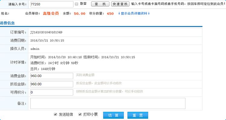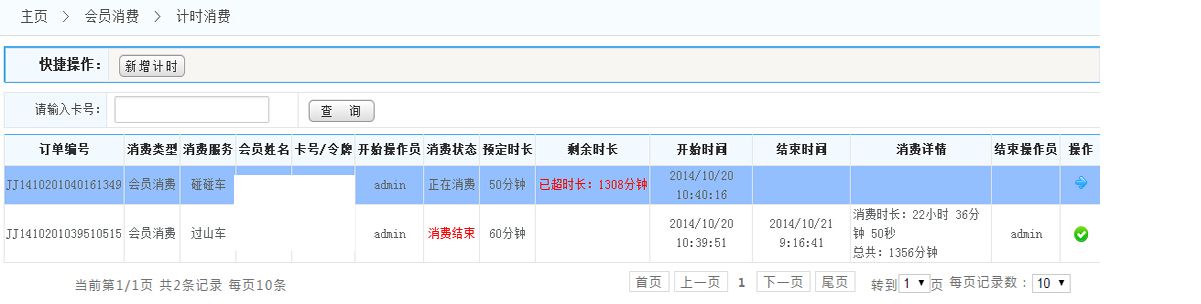 在文本框中輸入會員卡號,可查詢該會員的計(jì)時消費(fèi)記錄